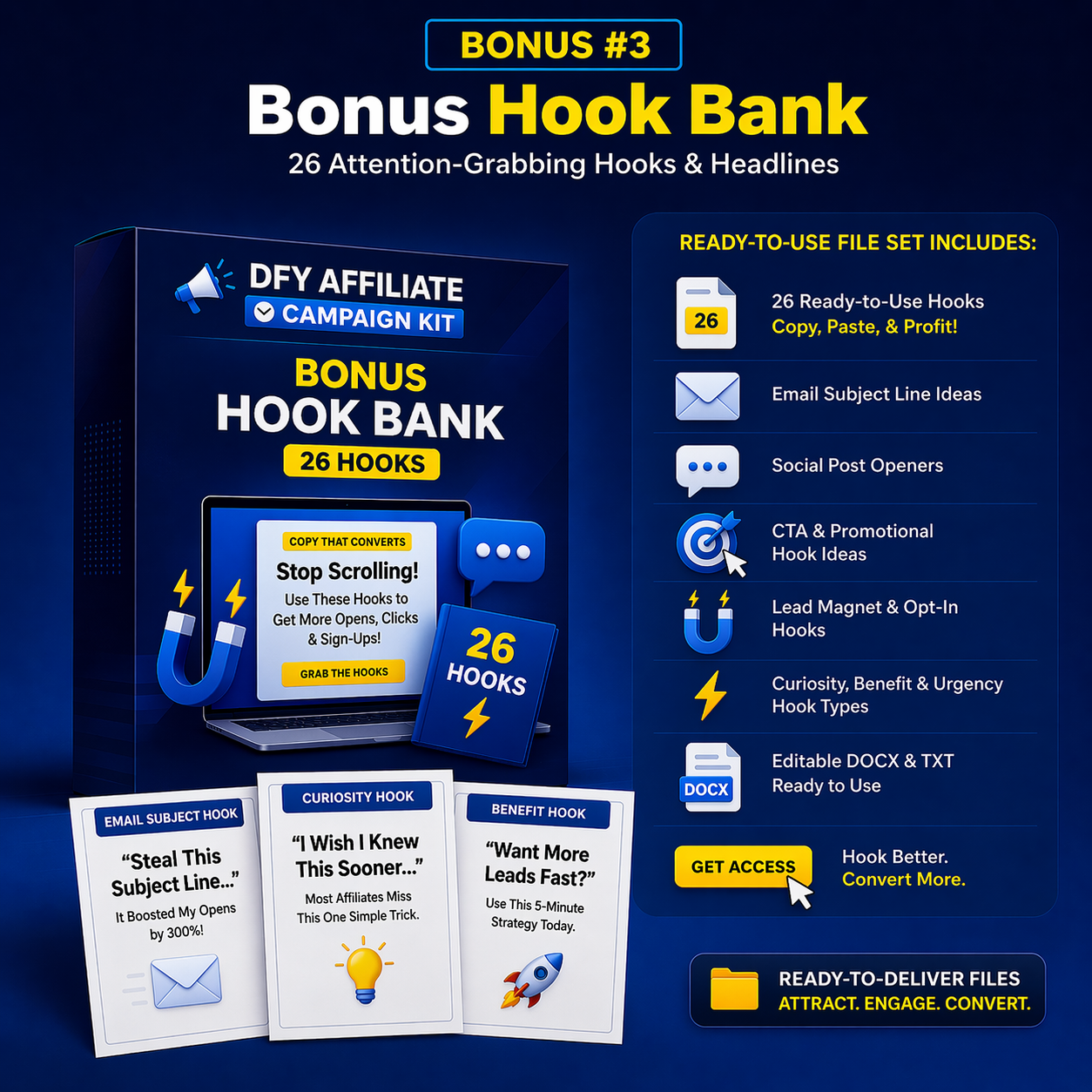 Show the hook swipe file as a quick-start bonus for emails, social posts, and CTAs.