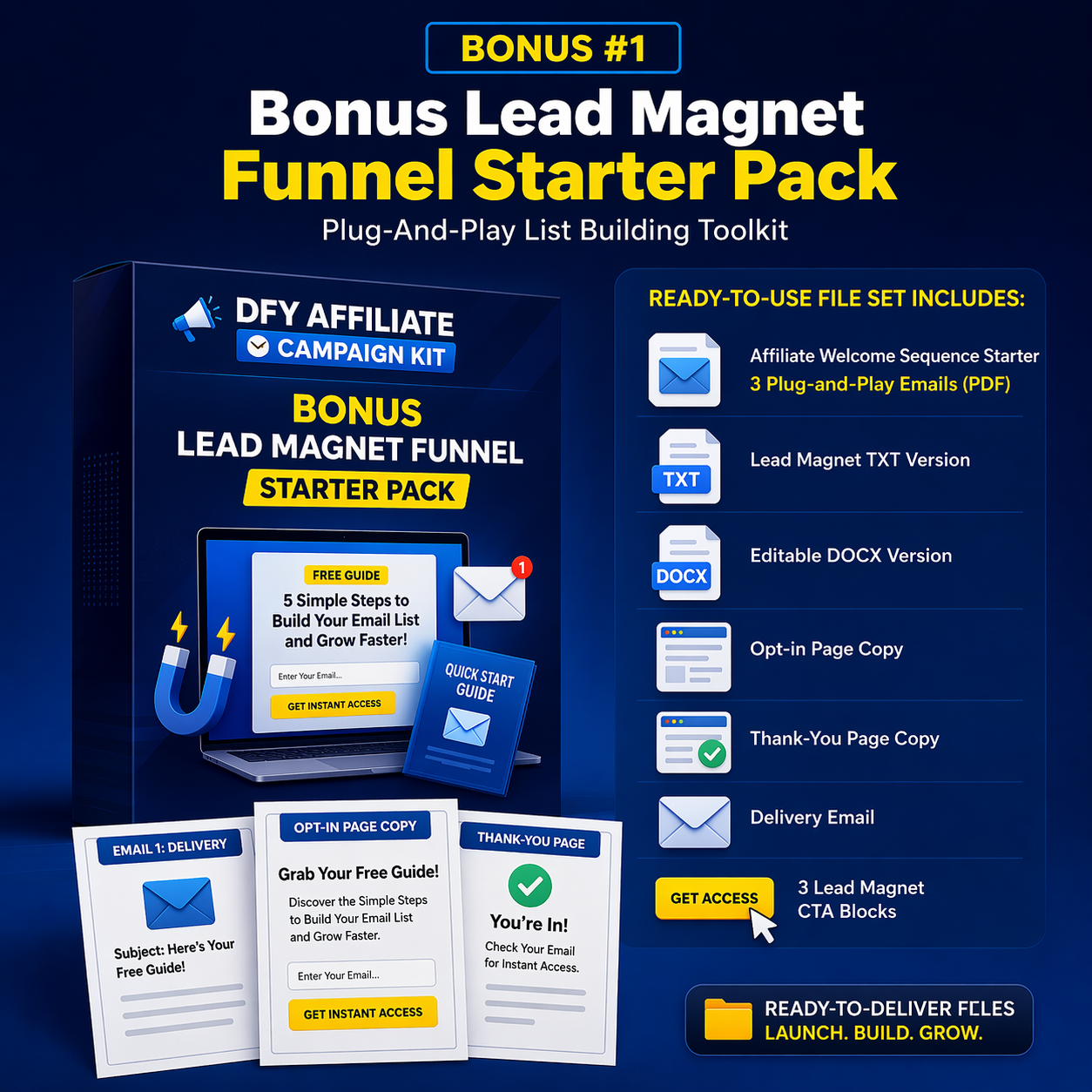 Launch an email list building campaign for affiliate offers without spending weeks creating assets. This done-for-you kit gives beginner to intermediate affiliate marketers and list builders everything needed to attract subscribers, nurture them with value, and promote offers—fast, clearly, and confidently