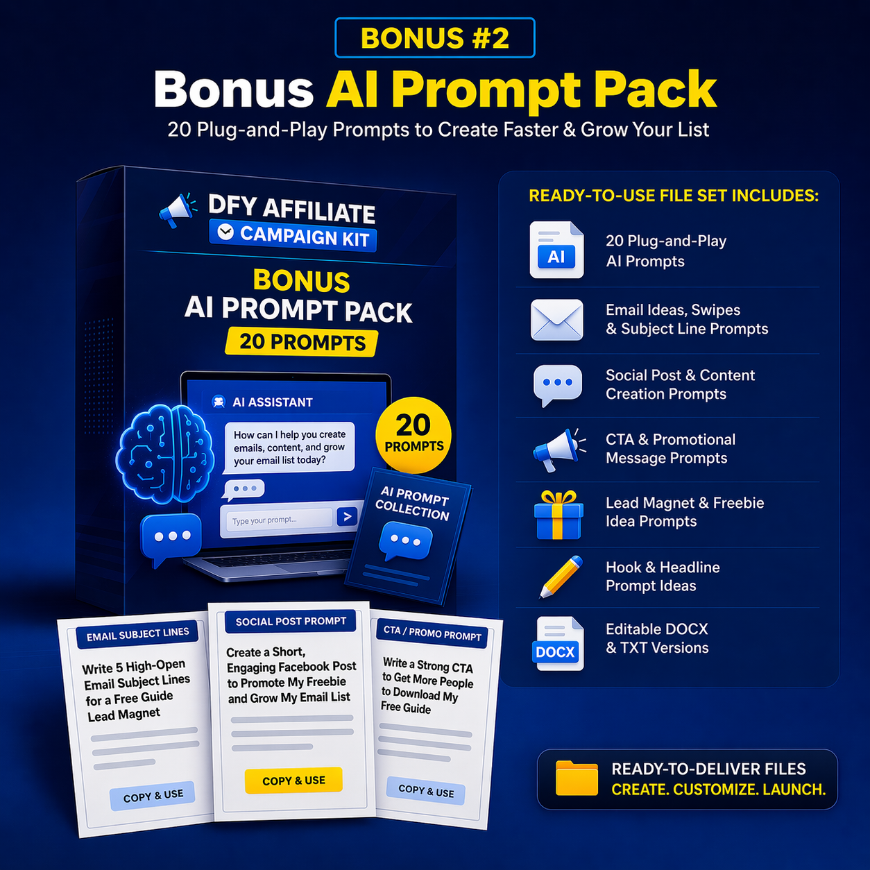 You receive a DFY affiliate campaign kit focused on email list building: 21 imported PLR articles, 1 topical map, 1 keyword list, 10 email swipes, 20 social posts, 10 CTA/promotional blocks, 5 lead magnet ideas, 1 product cover/mockup image, manifest/readme/license files, and a publishing and deployment guide. Bonuses include the Lead Magnet Funnel Starter Pack, the AI Prompt Pack (20 prompts), and the Hook Bank (26 hooks)